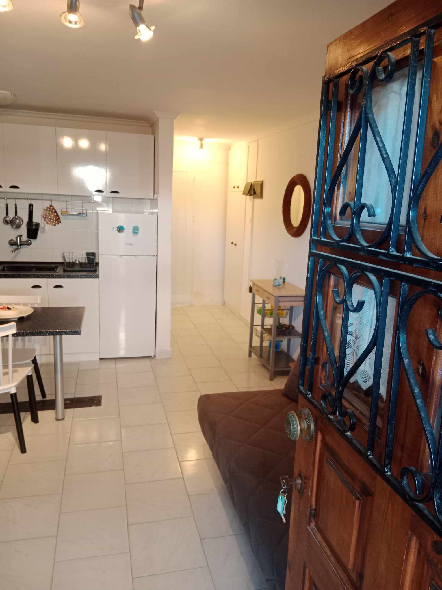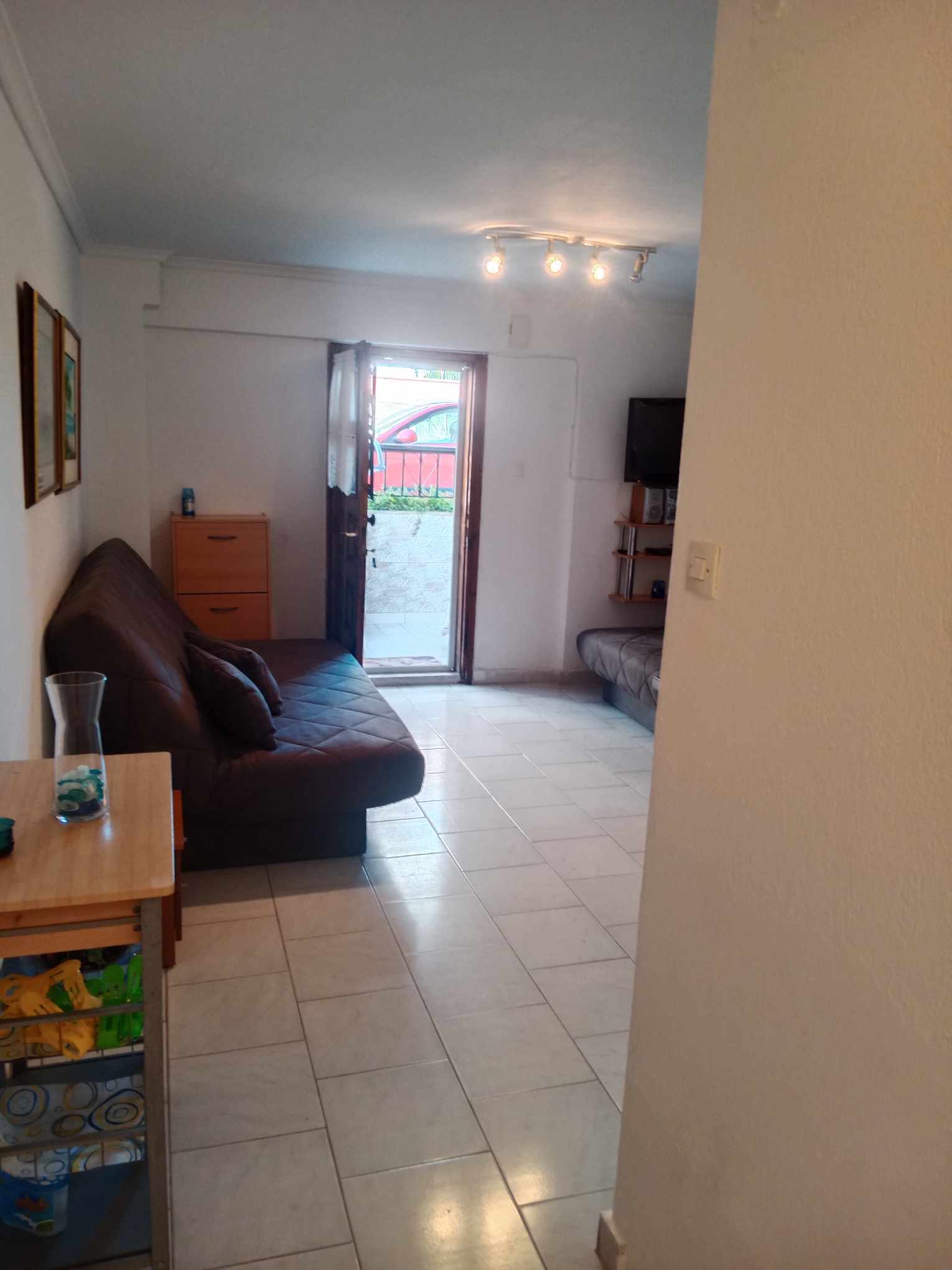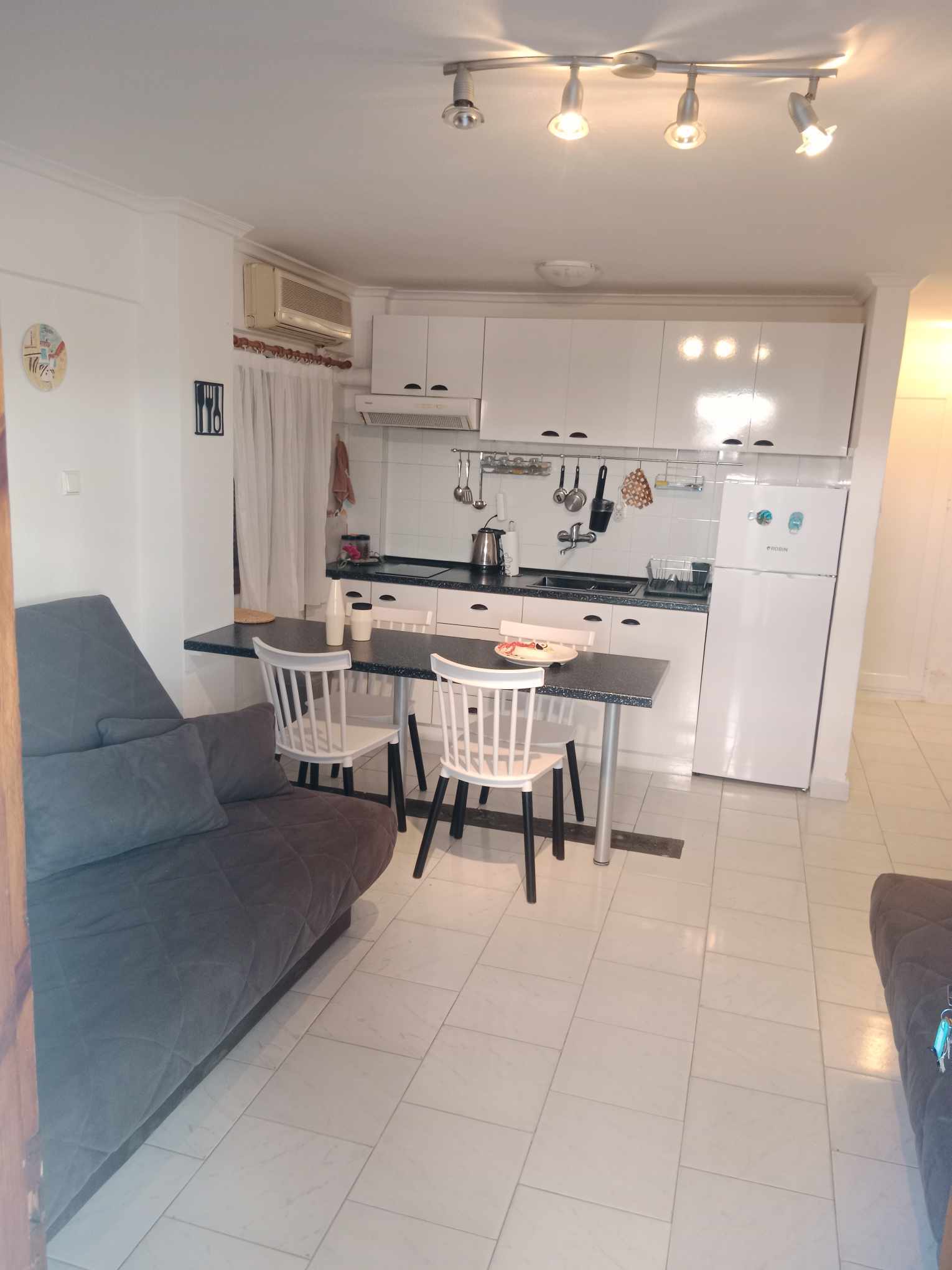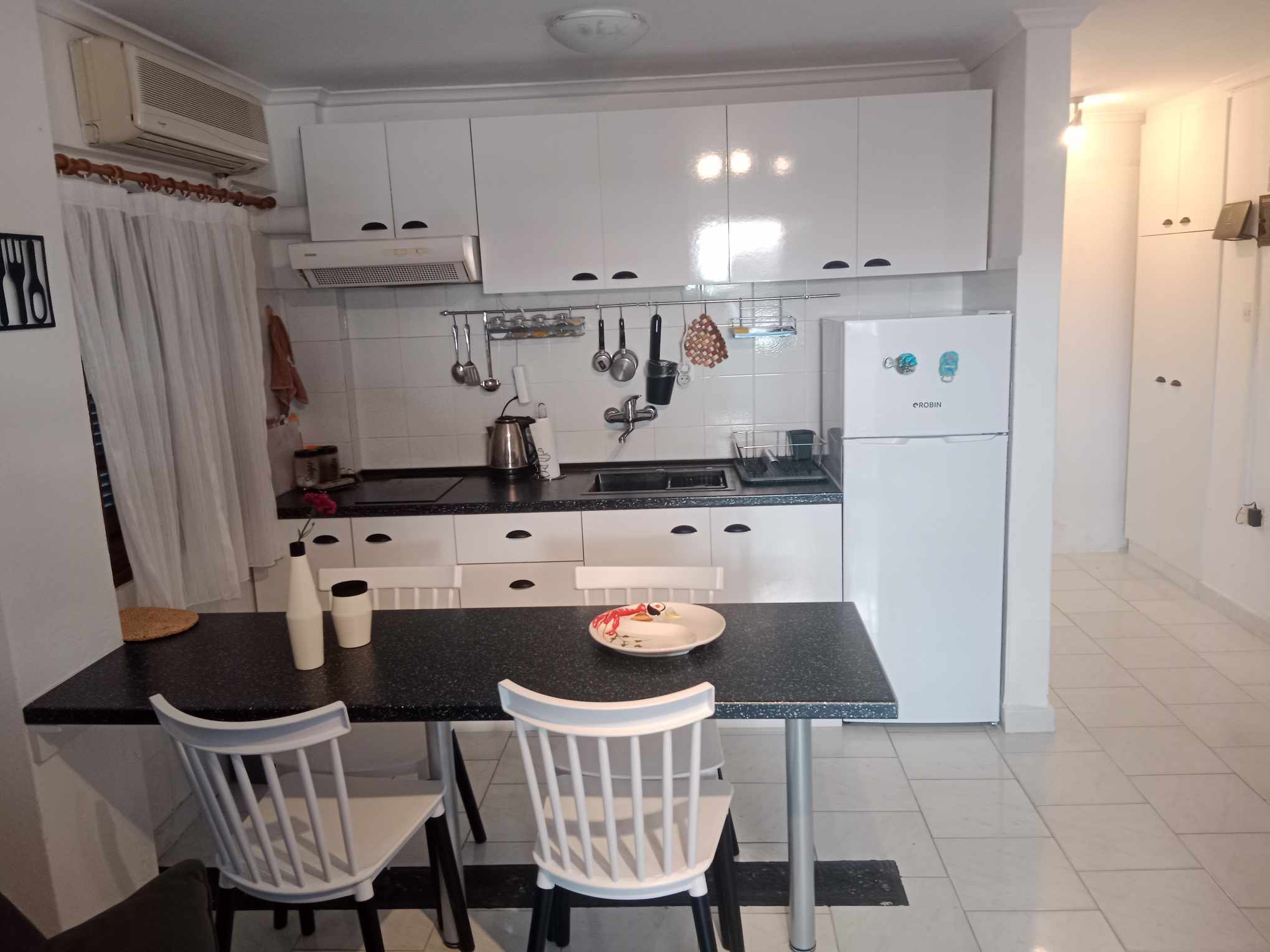 Во едната соба има еден брачен кревет. Во дневната два дупли кревети на развлекување.Дневната и кујната се споени. Кујната е опремена со основен прибор за подготовка на лесна храна. Има голема тераса. Апартманот се наоша на приземје или полусутерен со 3 скали надоле.