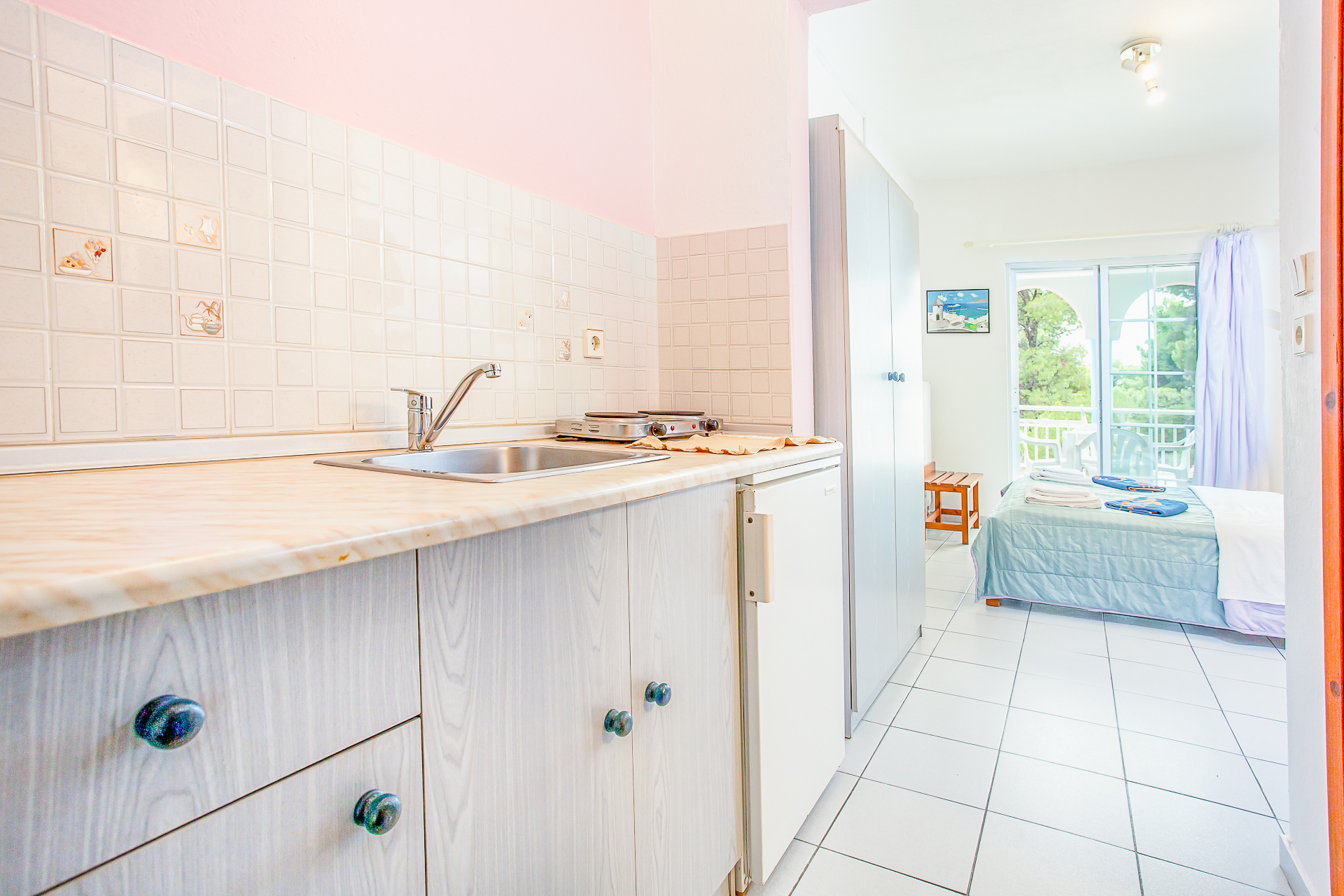 Двокреветна соба бр.408, 20 метри квадратни., во D зграда, со поглед кон задниот дел на градината, на втор спрат.