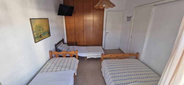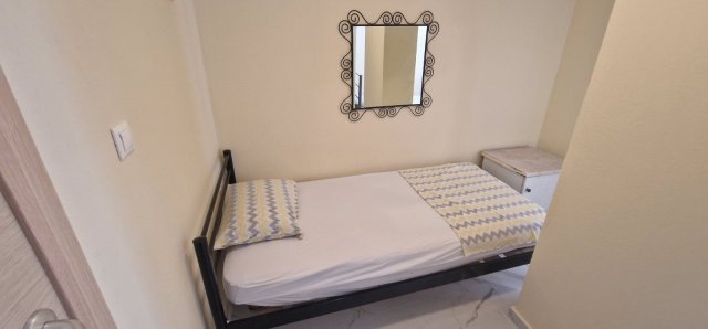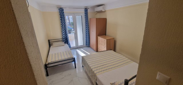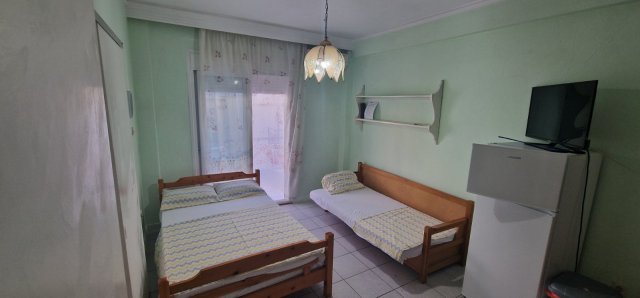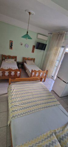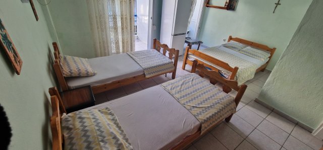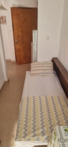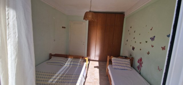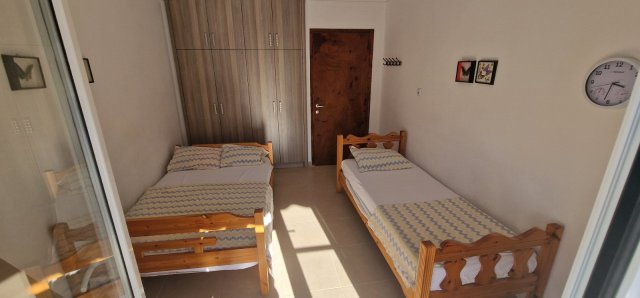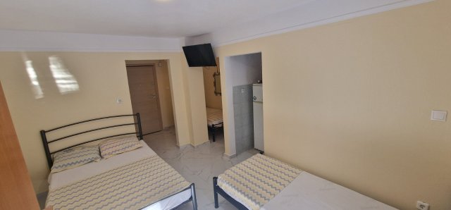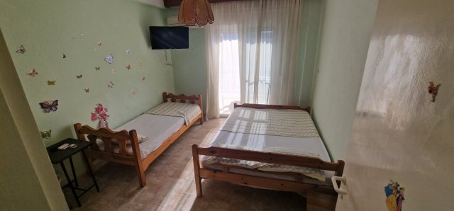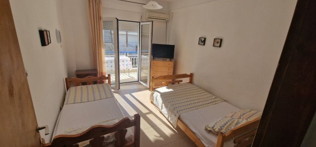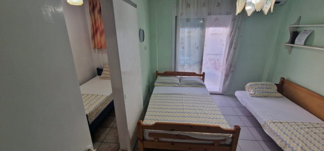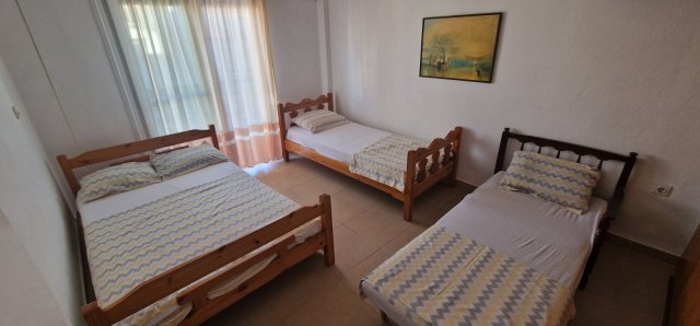 Апартманот има соба со брачен кревет,еден единечен и во другата соба една фотеља на спуштање (наменета за дете до 11.99год.)