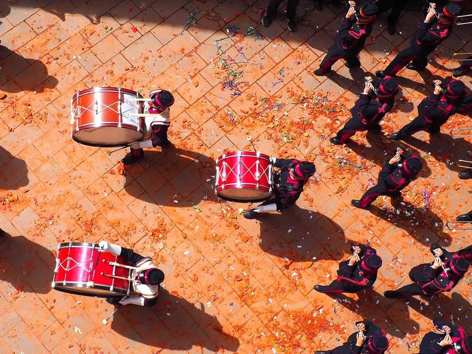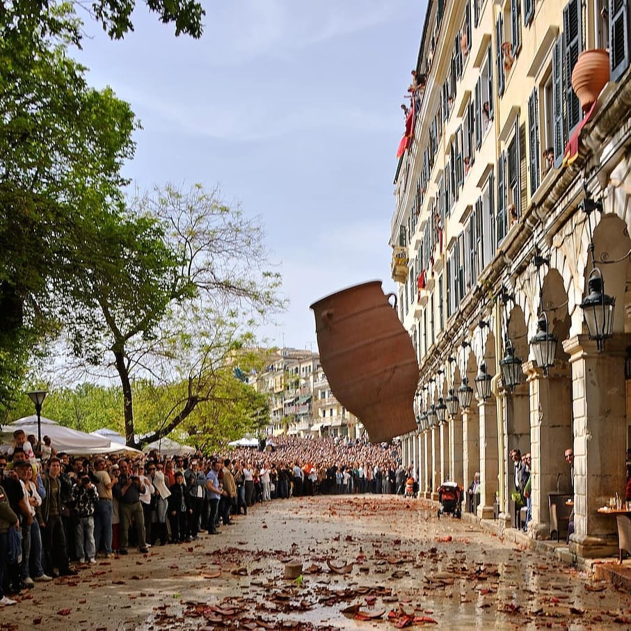 Точно во 11:00 часот, црковните ѕвона го означуваат „утринското воскресение“ и од прозорците на куќите почнуваат да се фрлаат глинени садови полни со вода, во знак на почнување на празникот и истерување на злото. Ова потекнува од стар венецијански обичај со кој за дочекот на новата година се ослободувале старите работи да направат простор за нови и подобри. Друго објаснување за овој обичај е дека има паганско потекло и дека со вревата направена од кршењето, Античките Грци сакале да ја разбудат Персефона, божицата на пролетта и да го забрзаат нејзиното доаѓање. Обичајот е да се земе парче од скршените глинени садови и да се сочува за среќа и здравје до следната година. Филхармонските групи се враќаат на улиците и почнуваат да свират весела музика.